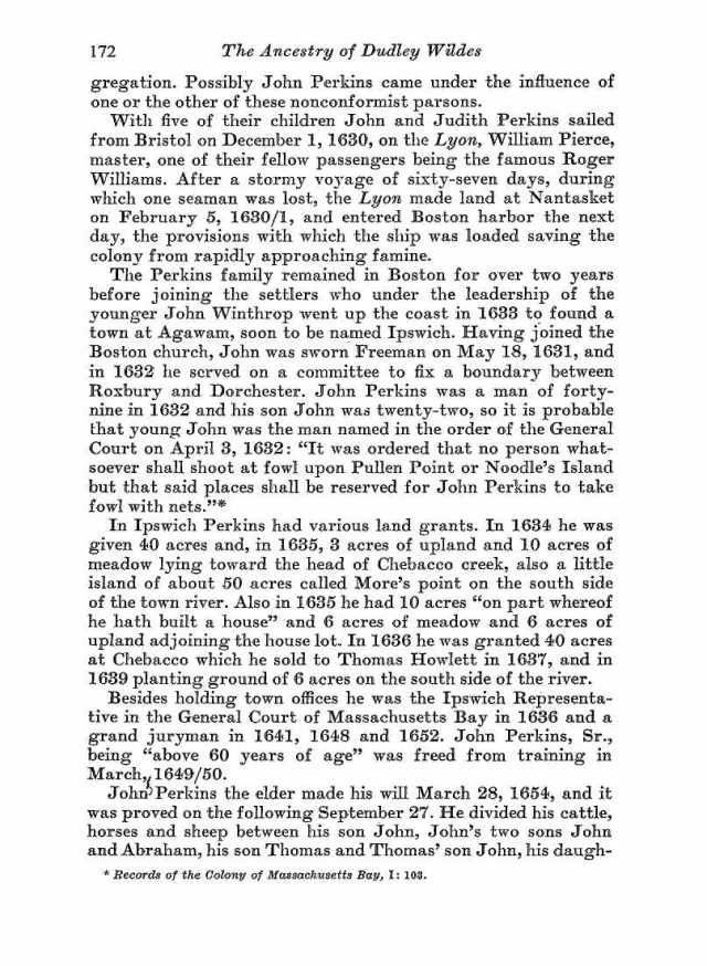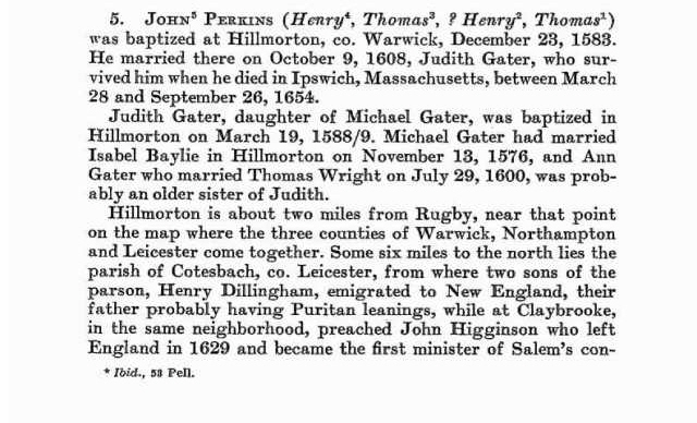 John Perkins was born in Newent, Gloucestershire, England and was baptized on 23 Dec 1583 in Hillmorton, Warwick, England.  His parents were Henry PERKINS  and  Elizabeth SAWBRIDGE.    He married Judith GATER on 9 Oct 1608 in Hillmorton, Warwickshire, England.  He sailed with his wife and five children from Bristol on 5 Feb 1631 and arrived in Boston in May 1631  on the first trip of the Lyon after a “very tempestuous voyage.” where one seaman was lost. Roger Williams [religious dissenter and founder of Rhode Island, if you fell asleep during the Puritans unit in 2nd grade] was one of their fellow passengers.  The provisions with which the ship was loaded saved the colony from an approaching famine.  John died in 1654 in Ipwich, Essex, Mass. ( between 28 Mar 1654, when he wrote his will, and 26 Sep 1654, when his will was probated; he was 71)