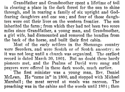 Robert McConahey was a native of Ireland who settled in Westmoreland County. In 1798 he arrived in South Shenango with knapsack and camp kettle on his back, and settled upon a farm which he afterward occupied. He built a rough cabin and, leaving some of his possessions within it returned to Westmoreland County for horses, sheep and cattle which he drove before him over the mountains. Upon his arrival he found that Indians had broken in and stolen his clothes and dishes during his absence.