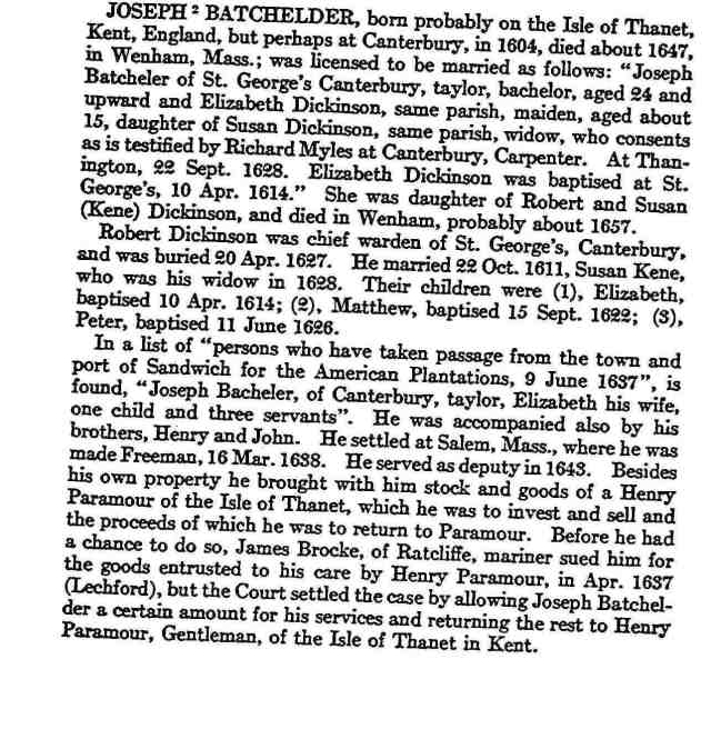 Joseph, of Canterbury, co. Kent , and of Salem and Wenham, Mass., tailor, whose name appears on the second passenger list given above, was of the parish of St. George, Canterbury, and was a bachelor, aged about 24 and upwards on 22 Dec 1628, when a licence was granted for his marriage with Elizabeth Dickinson, of the same parish, virgin, aged about 15, daughter of Susan Dickinson, of the same parish, widow, In this licence he is called Joseph Batcheler. The marriage was to be solemnized at Thanington. [Cowper’s Canterbury Marriage Licences, Second Series , column 74] The printed “Register Booke of the Parish of St. George,” Canterbury, pg 24, contains the record of the baptism of Elizabeth Dickenson, daughter of Robert Dickenson, 10 Apr 1614. The same parish register also shows that John, son of Joseph Bacheler, was buried 1 May 1631 (pg 184), that Mary and Martha, daughters of Joseph Bachelor and Elizabeth Diconson his wife, were baptized 20 June 1634 ( p. 32) and were buried the same day (p. 185), and that Mark , son of Joseph Bacheler and Elizabeth Dickinson his wife , was baptized 4 Oct 1635 (p. 32). Joseph Bachelor settle d at Salem, whence he removed to Wenham. He died in 1 mo . 1647/8. [Cf. Pope’s, Pioneers of Massachusetts, p, 26 ] He was probably a brother of Henry and John Bachelor, whose names appear on the same passenger list. (English Origins of New England Families)