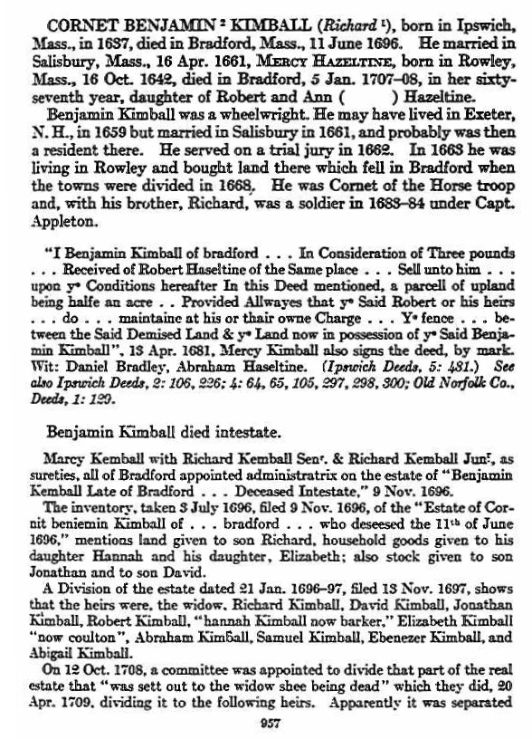 | 11. | Benjamin Kimball | 12 May 1637 Ipswich, Mass | Mercy Hazeltine Apr 1661 Salisbury, Essex, Mass. |