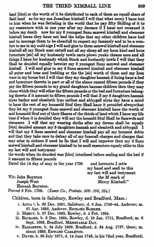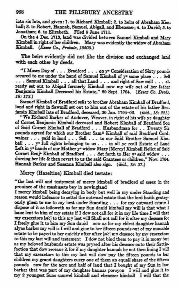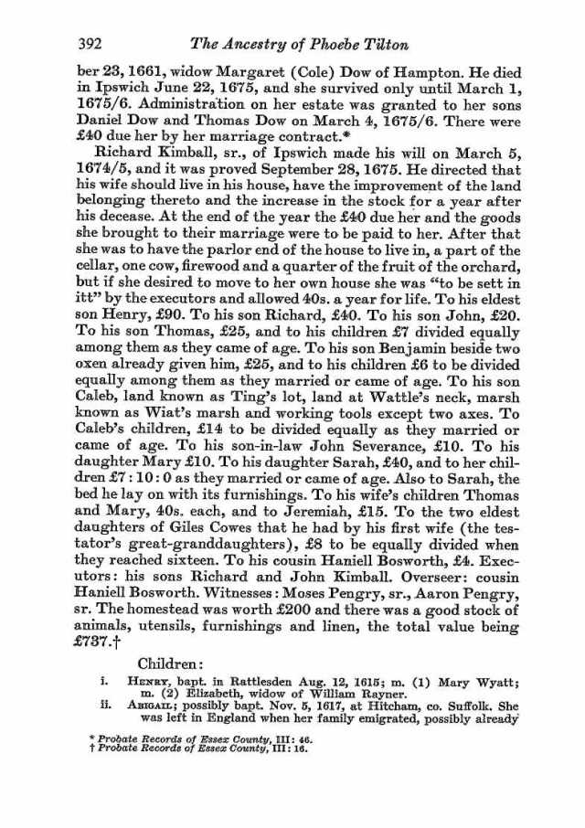 To his wife’s children Thomas and Mary, 40s. each, and to Jeremiah, £15. To the two eldest daughters of Giles Cowes that he had by his first wife (the testator’s great-granddaughters) £8 to be equally divided when they reached sixteen. To his cousin Haniell Bosworth, £4. Executors: his sons Richard and John Kimball. Overseer: cousin Haniell Bosworth. Witnesses: Moses Pengry, sr., Aaron Pengry, sr. The homestead was worth £200 and there was a good stock of animals, utensils, furnishings and linen, the total value being £737.