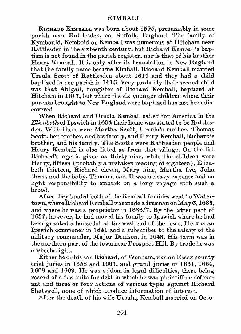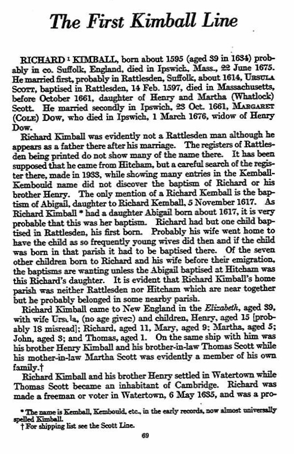 Richard Kimball was born 10 Apr 1595 in Rattlesden, Suffolk, England. He may be the son of Henry KEMBOLD and Sysley [__?__] of Hitcham, Suffolk, England. He married Ursula SCOTT about 1614 (23 Oct 1615 is after the birth of Henry Jr.) in Rattlesden.