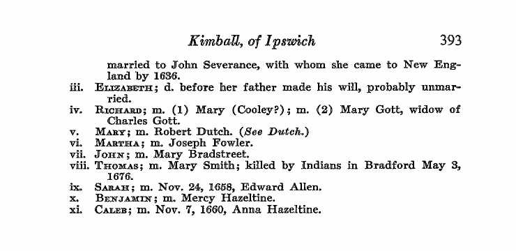 Richard Sawtelle’s wife, named Elizabeth, was probably a daughter of one of the early Watertown settlers, but which one is unknown. Richard Kimball had a daughter, Elizabeth, of marriageable age and was living in Watertown at the time. She was still living when her father died, but who she married is unknown. However, there were at least two other Watertown men who married Elizabeths about that time, but there is no clue as to which of these was Elizabeth Kimball, if any.