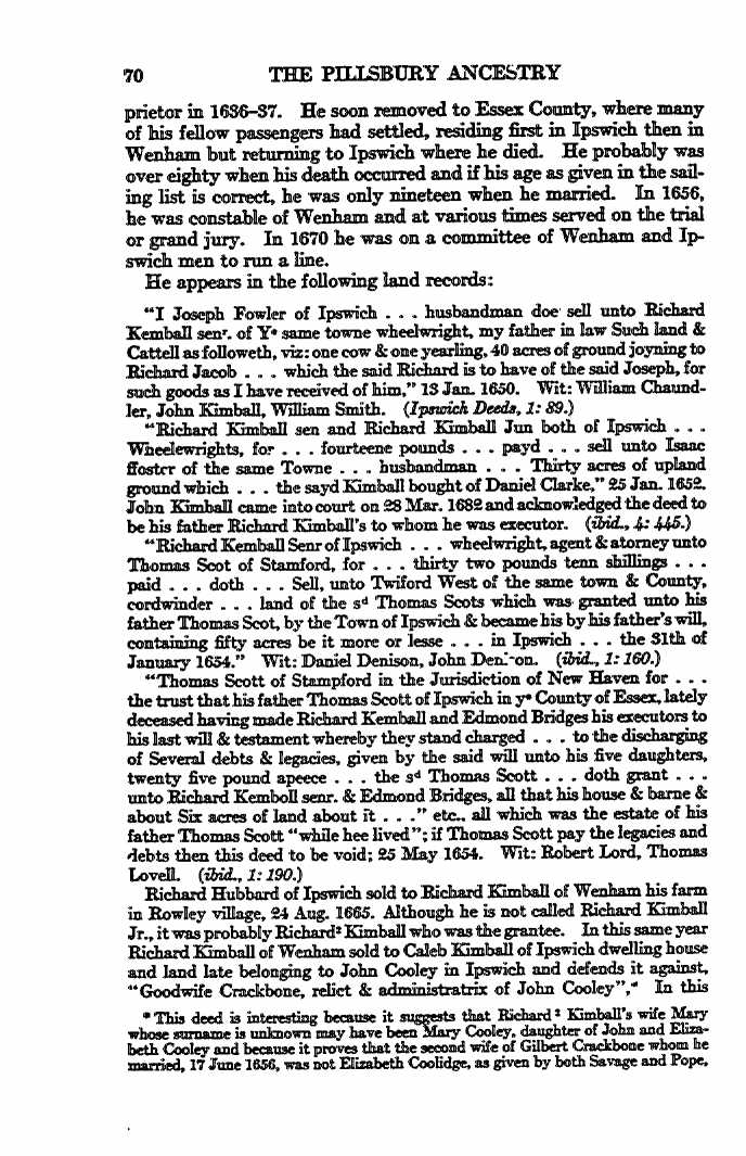 In a deposition dated Sep 1658, Richard mentions having “lived on Goodman Shatswell’s farm for seven years.” He removed to Wenham between 1652 and 1656, settled in the westerly part of the town, and was the first settler named Kimball in that town. It seems that he was the largest taxpayer among the early settlers. That he owned large amounts of lands at different times is shown by the records of numerous conveyances in the records at Salem, Nov 8, 1657, he subscribed £3 to the minister’s rate, to be paid one-half in wheat and one-half in Indian corn. The next year he was chosen selectman, and was continued in that office with the exception of three years, till 1674. December 4, 1660, he was one of a committee to see about building a new meeting house. Feb 28, 1663, the town leased two hundred acres of the best of its common land for one thousand years to Abner Ordway, Thomas Searles, John Edwards and Richard Kimball Jr. Richard Kimball was one of a committee to perfect the line between Bass River and Wenham, and Jul 18, 1673, was one of a committee to establish rates for the cost of building a meeting house.