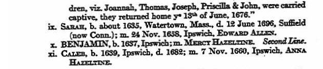 Benjamin’s wife Mercy Hazeltine was born 16 Oct 1642 in Rowley, Mass. Her parents were Robert Hazeltine and Ann [__?__]. Mercy died 5 Jan 1707/08 in Bradford, Mass.