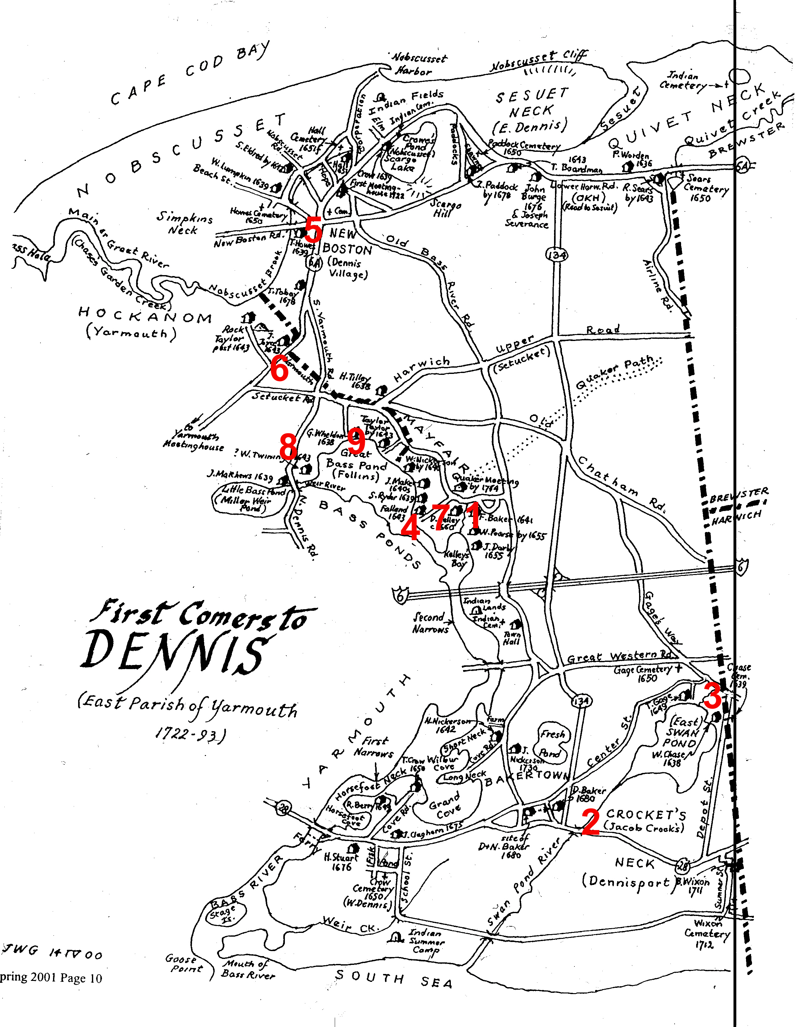 Nine of our ancestral families were first comers in Dennis: 1 . Francis Baker, 2. Daniel, Baker, 3. William Chase, 4. Thomas Folland, 5. Thomas Howes, 6. John Joyce, 7. David O’Kelley, 8. William Twining, 9. Gabriel Weldon. Map courtesy of Lynn Keller and Cape Cod Genealogical Society