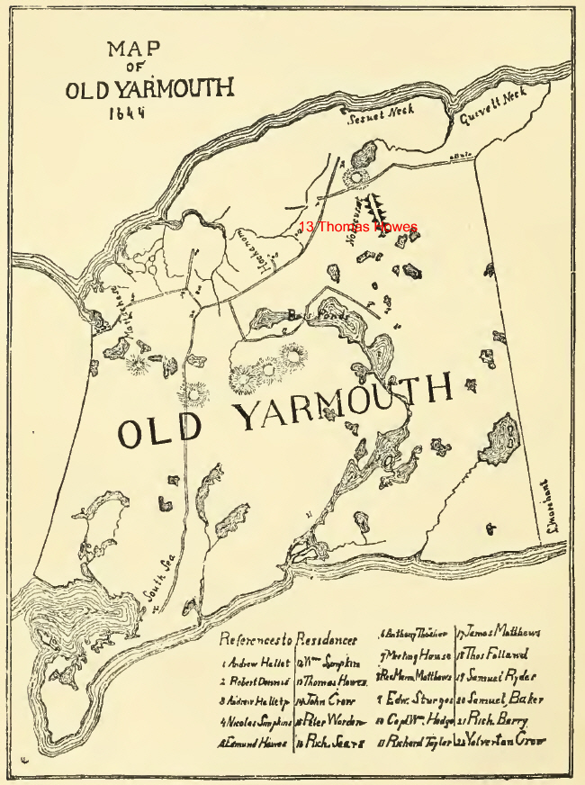 Thomas was a Constable in 1644, and of the Council of War in 1658. He was frequently one of the Deputies to the Colony Court, but was evidently disinclined to public service. Mr. Howes was once fined for not attending Court, but the fine was remitted, he presenting a valid excuse.