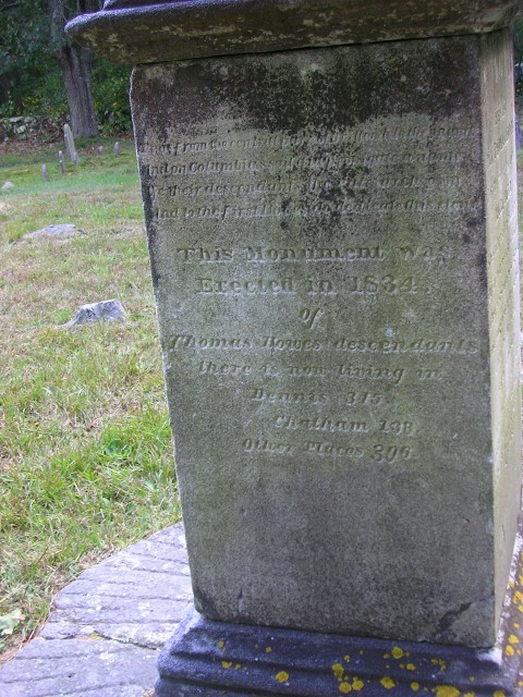 Thomas Howes Memorial = On the side of the monument it is indicated that the number of Thomas Howes descendants then (1834) living were as follows: 315 in Dennis,MA, 138 in Chatham,MA, and 396 in “other places”.1637 – Arrived in Salem, MA 1639 – Moved to Old Yarmouth, Mass. Settled in Dennis, Mass.1644 – Appointed Constable 1652 – Appointed to recieve “oil of the country” 1652 – Deputy to the General Court 1658 – Member of Council of War
