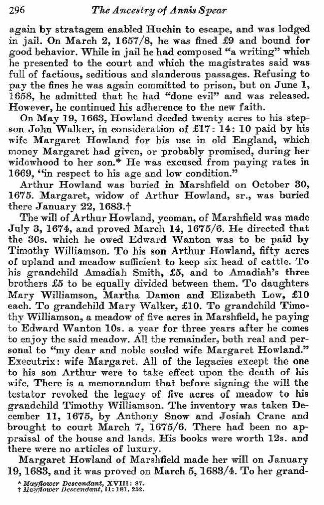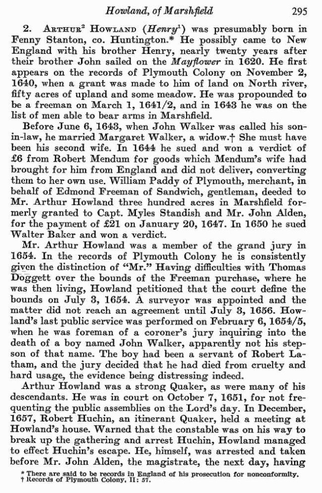 “Arthur Howland, who came over with his brother Henry, settled in Marshfield. Three hundred acres of upland in Marshfield were granted July 2, 1638, to Capt. Myles Standish and Mr. John Alden, “lying on the north side of South River, bounded on the east by Beaver Pond, and on the west by a brook,” which later for a conUsideration of £21 sterling was conveyed to Arthur Howland.