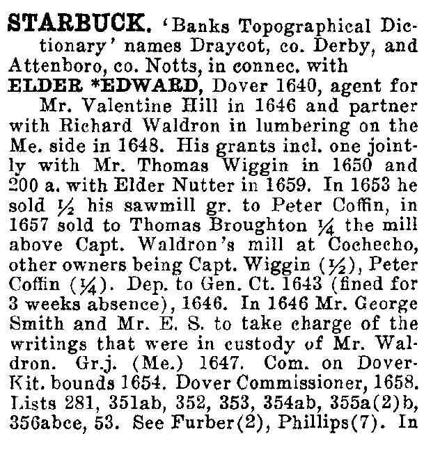 Starbuck’s Marsh was granted to Edward August 30, 1643, and Starbuck’s Point and Marsh, now called Fabyan’s Point, were granted to Edward in 1643. He is recorded several times as called on to be one of the “lot-layers.” He was Representative in the General Court in 1643 and 1646, was an Elder in the church and in other ways enjoyed the respect and esteem of his fellow-citizens. In 1640, Edward was an agent for Mr. Valentine Hill and Partner with Richard Waldron in lumbering on the Me. side in 1648. In 1653 he sold 1/2 his sawmill gr. To Peter Coffin, in 1657 sold to Thomas Broughton 1/4 the mill above Capt. Waldron’s mill at Cochecho.