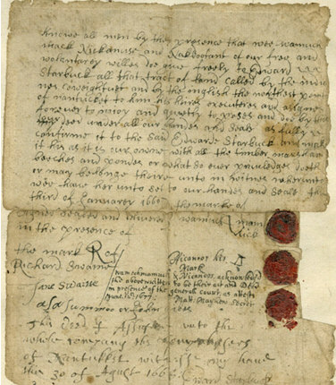 1665 Indian deed transfering Coatue land to Edward Starbuck. Includes "mark" of Nickanoose, Wampanoag sachem