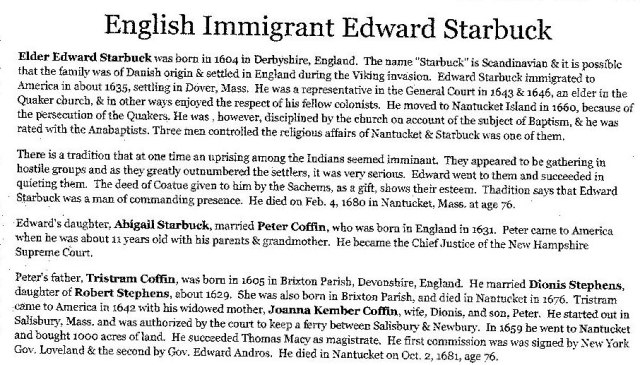 This is an awesome history page. I am also an Edward Starbuck Derbyshire England descendant! My great great grandmother was Martha Starbuck Outland (from the George Starbuck line in Nantucket and then in Belmont County Ohio)