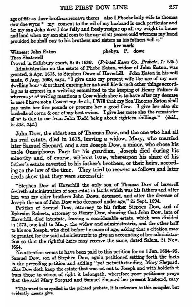 Hers was not a vast dowry, the cattle and household goods worth less than £10. She had a home with her son John for seven years and that John made all the payments required in the will. After that, she married John Eaton, witness to the will. He was a cooper of Salisbury, who came to Haverhill 1646, was selectman 1648, thrice married, with 7 children, 6 surviving to become step children of Phebe Dow. They returned to Salisbury, where he died 29 Oct 1668 or 1 Nov 1682 – Salisbury, Essex, Mass, she 3 Nov 1672.
