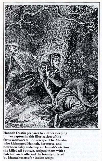 Hannah had risked precious time to gain those scalps. The explanation sometimes given later, that her story would not be believed without evidence, is patently false. If her credibility were the only issue at stake, sooner or later there would be corroborative accounts. Actually, Hannah Bradley, another Haverhill woman, was a captive in the camp where the wounded squaw sought refuge. But to collect a scalp bounty Hannah needed to produce the scalps.
