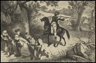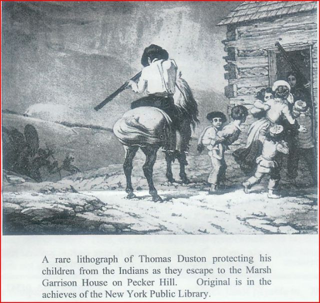 Early the next morning, Thomas, at work near the house, suddenly spied the approaching Indians. Instantly seizing his gun he mounted his horse and raced for the house, shouting a warning which started the children towards the garrison, while he dashed into the house hoping to save his wife and the baby. Quickly seeing that he was too late, and doubtless urged by Hannah, he rode after the children, resolving to escape with at least one. On overtaking them, finding it impossible to choose between them, he resolved, if possible, to save them all. A few of the Indians pursued the little band of fugitives, firing at them from behind trees and boulders, but Thomas, dismounting and guarding the rear, held back the savages from behind his horse by threatening to shoot whenever one of them exposed himself. Had he discharged his gun they would have closed in at once, for reloading took considerable time. He was successful in his attempt, and all reached the garrison safely, the older children hurrying the younger along, probably carrying them at times. This was probably the garrison of Onesiphorus March on Pecker’s Hill.