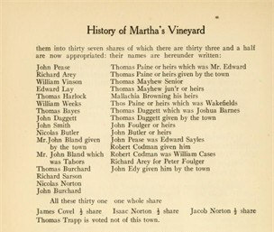 Nicholas Norton was one of the first share holders of Martha’s Vineyard – On Aug. 22, 1659 “Goodman” Norton was granted “a Lott of forty acres of Land” located north of the Great Swamp and south of the present road to West Tilsbury. He also owned land at Sanchacantackett in the vicinity of Major’s Cove where his descendants lived for two centuries, and he owned a plot of meadow land at Aquampache.