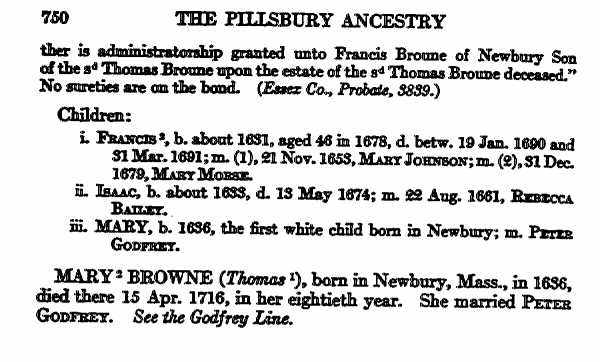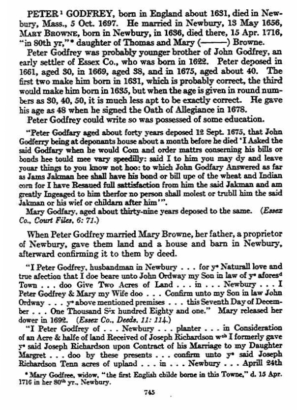 Mary’s husband Peter Godfrey was born in England about 1631. Peter died in Newbury, Mass 15 Apr 1716 in his 80th year. Alternatively, Peter died 5 Oct 1697 in Newbury, Essex, Mass.