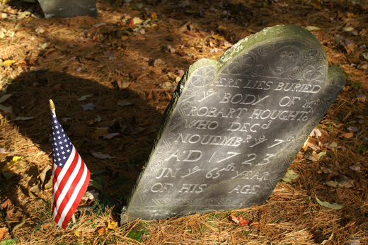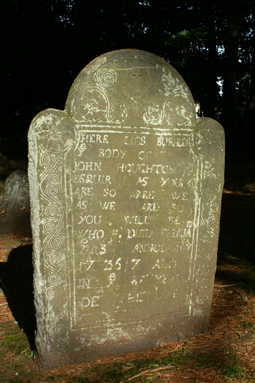 John Houghton Jr – Headstone  – Here Lies Buried Ye Body of John Houghton, Esquir, As You Are So Ware We. As We Are So you Will be. Who Died February ye 3d Anno Domini – 1736/7 and in ye 87th Year of his Age. Burial: Old Common Burial Ground, Lancaster, Worcester County, Massachusetts