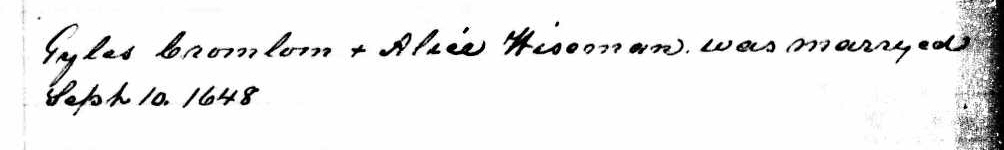 Giles Cromwell was born about 1603 in Salisbury, Wiltshire, England. His parents were Sir Oliver CROMWELL and Anne HOOFTMAN.  He married Alice WICKES on 20 Feb 1629/30, in Erling, Hampshire, England. After Alice died, he married Alice Wiseman on 10 Sep 1648 in Newbury, Mass.   Giles died  25 Jun 1673, Newbury, Mass.