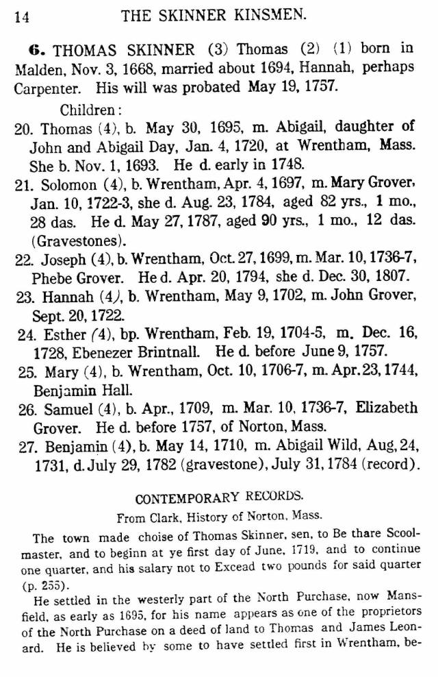 | 1. | Thomas SKINNER IV | 30 May 1695 in Wrentham, Mass | Abigail DAY5 Jan 1719/20 Wrentham, Mass | 17 Feb 1748/49 in Mansfield, Bristol, Mass. |