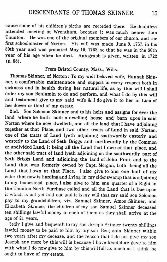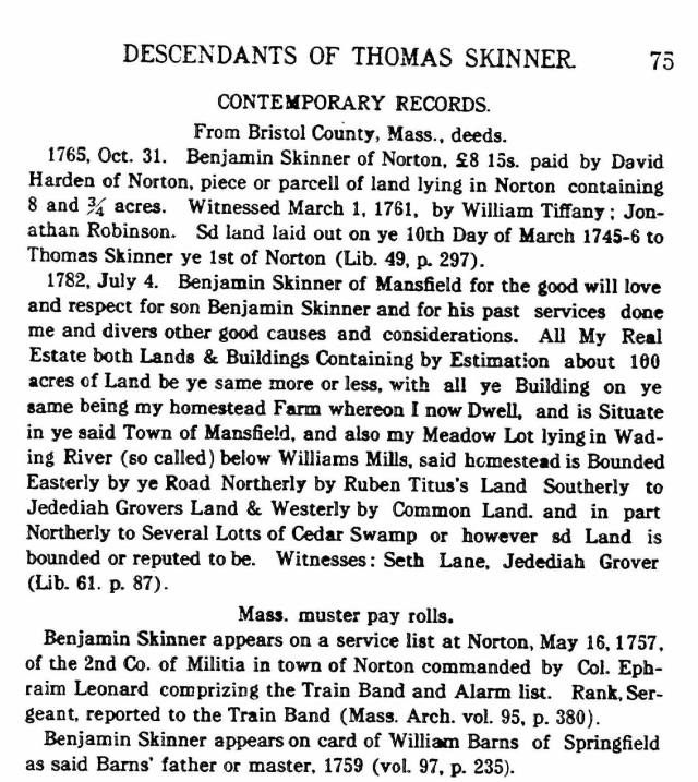 “ Thomas Skinner Senr. of Town of Norton in the County of Bristol House Carpenter for the Love and good will which I have and do bare to Thomas Skinner my son of Norton House Carpenter 50 acres of Land being upland ground and swamp situate in said Town of Norton. Signed Jan. 4, 1721. In presence of Ebenezer Brintnall; John Grover. Thomas Skinner appeared and acknowledged same, Nov. 10, 1724, Recorded May 29, 1779.