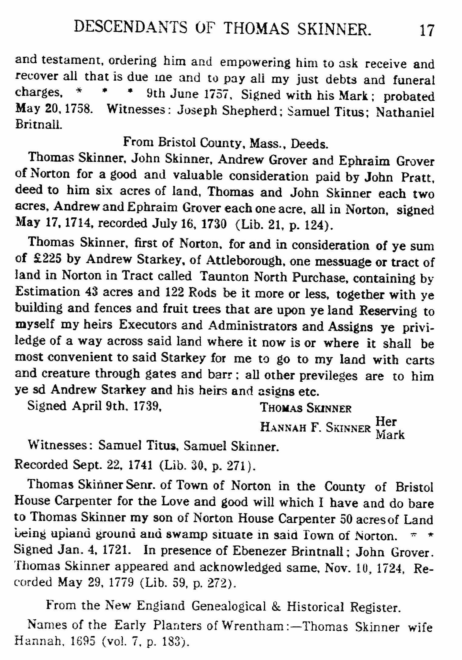 “ Thomas Skinner, first of Norton, for and in consideration of ye sum of £225 by Andrew Starkey, of Attleborough, one messuage or tract of land in Norton in Tract called Taunton North Purchase, containing by Estimation 43 acres and 122 Rods be it more or less, together with ye building and fences and fruit trees that are upon ye land Reserving to myself my heirs Executors and Administrators and Assigns ye priviledge of a way across said land where it now is or where it shall be most convenient to said Starkey for me to go to my land with carts and creature through gates and barr; all other previleges are to him ye sd Andrew Starkey and his heirs and asigns etc. Signed April 9th. 1739, Thomas Skinner, Hannah F. Skinner, Her Mark. Witnesses: Samuel Titus, Samuel Skinner. Recorded Sept. 22, 1741.” (52)