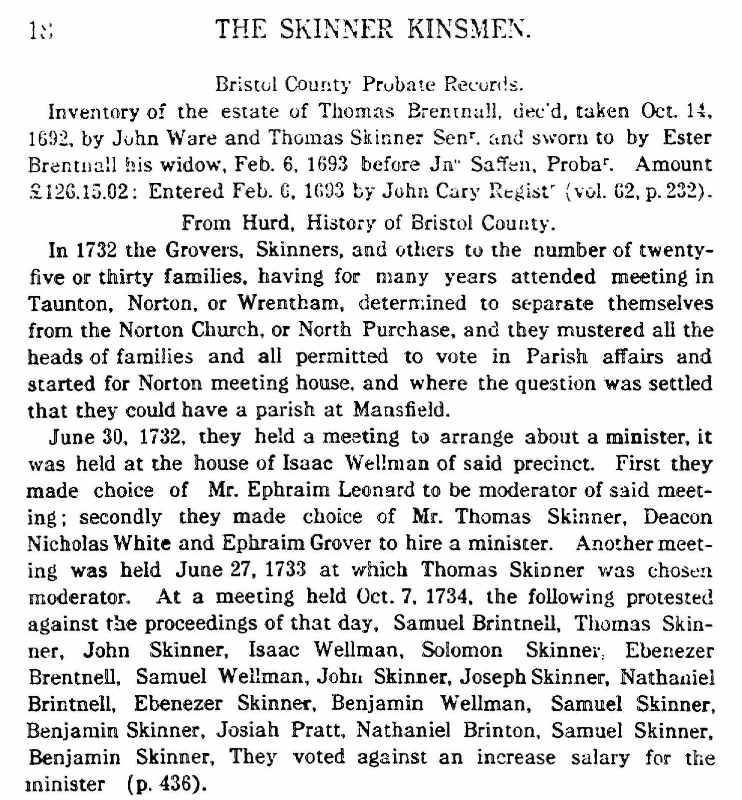 6th. I give and bequeath to my two daughters, one Hannah Grover the wife of John Grover of said Norton, and Esther Brintnall, the widow of Ebenezer Brintnall late of Norton, deceased, all my household goods except what by this will I have already mentioned. Reason I do not give anything to children and heirs of my son Thomas, deceased, is because I gave to my son Thomas in his lifetime by a deed of gift the Land where he built and settled on, which I think is the full of what he ought to have of my estate, and I do give to my son Benjamin all that justly due to me from any person or persons, and I do order him to pay all my just debts, and I do hereby constitute and appoint my son Benjamin Skinner to be my sole executor to this my last will and testament, ordering him and empowering him to ask receive and recover all that is due me and to pay all my just debts and funeral charges. 9th June 1757, Signed with his Mark; probated May 20,1758. Witnesses: Joseph Shepherd; Samuel Titus; Nathaniel Britnall.
