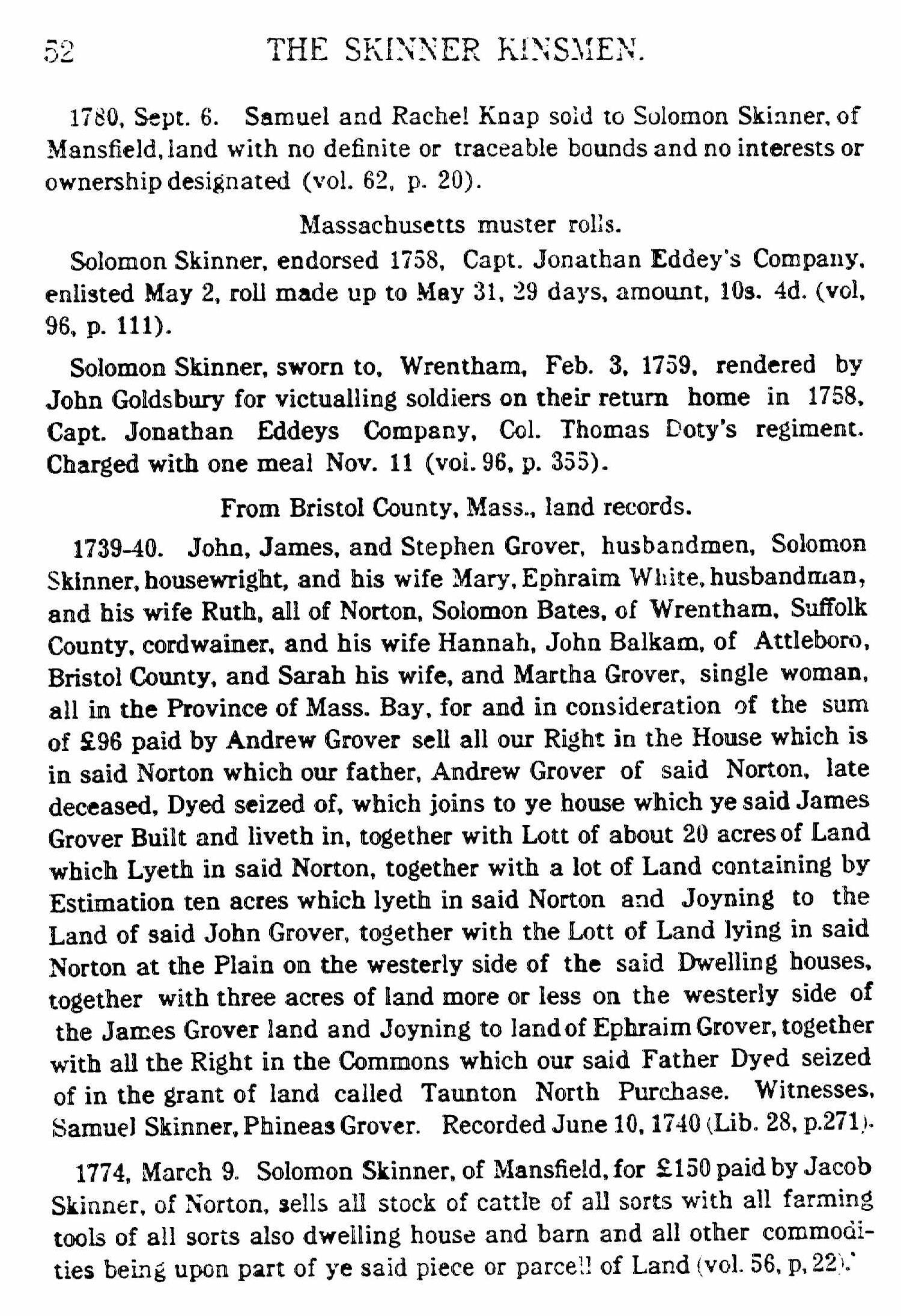 From the Bristol County, Massachusetts Deeds: “Thomas Skinner, John Skinner, Andrew Grover and Ephraim Grover of Norton for a good and valuable consideration paid by John Pratt, deed to him six acres of land, Thomas and John Skinner each two acres, Andrew and Ephraim Grover each one acre, all in Norton, signed May 17,1714, recorded July 16, 1730.” (51)