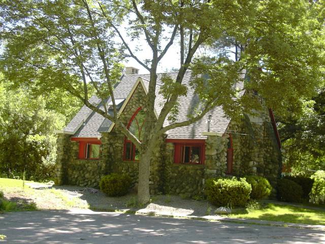 The chapel is built on one of the oldest settled spots in Norfolk. Daniel POND from Dedham took a portion of the grant to Dedham to found a colony near the lakes in Wrentham. His son Ephraim, and a friend of John Fales – their wives were sisters, made their homes here. The chapel was built in 1909 by Dr. Oliver Cressy of Hamilton in memory of his son, Oliver Sawyer Cressy Jr. Dr. Cressy’s wife, Harriet L. Pond, was a daughter of General Lucas Pond, who built the Pond Home in 1832. It is a very unique building constructed of natural field rock in the Gothic Revival style with blue stone copings, stone buttresses and a roof of slate and metal. The interior was finished in hardwood with polished surfaces, windows of stained glass and an old English style fireplace. The building was built for use of the Pond Home for the Aged (now in Wrentham) and for the village of Pondville for Sunday services, social work and for use in conjunction with the Pondville Cemetery for funeral services and memorials. This quaint wayside chapel remained vacant for many years and most of the beautiful stained glass windows were destroyed by vandals during this time but it was renovated and converted into a private residence in the last quarter of the 20th century.
