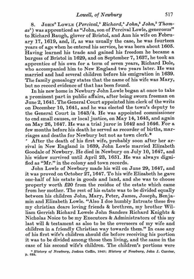 When Percival Lowell decided to come to the Massachusetts Bay Colony in 1639, his entire family accompanied him: his wife, Rebecca; their three children, John, Richard, and Joanna; spouses of their children; their grandchildren; and several others associated with the Lowell business. Among those coming was Richard Dole, as he had five more years of his apprenticeship to serve with John. After Mary died, he married Elizabeth GOODALE in 1640 in Newbury, Mass. John died 10 Jul 1647 in Newbury, Mass.