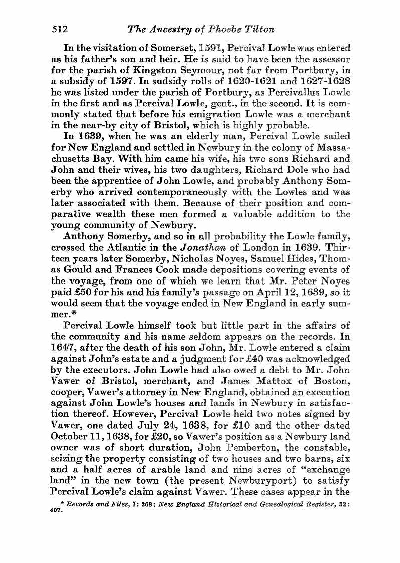 m.bef.1573 Bristol, Somersetshire, England; Anne Percival.  The Lowell “Historic Genealogy” leaps to the happy conclusion that this ‘daughter of Perceval’ was one of the daughters of the contemporary head of that Somersetshire household Edmund Percival of Weston-in-Gordano who died in 1551. Weston-in-Gordano is very close to Portbury and Clevedon and a match is possible, but there is no direct evidence.