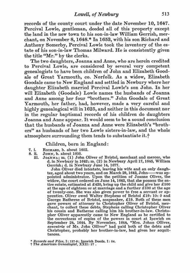 Joanna’s first husband John Oliver was born 1613 in Bristol, Somerset, England. His parents were James Oliver and Frances Cary. John died 1642 in Newbury, Essex, Mass.