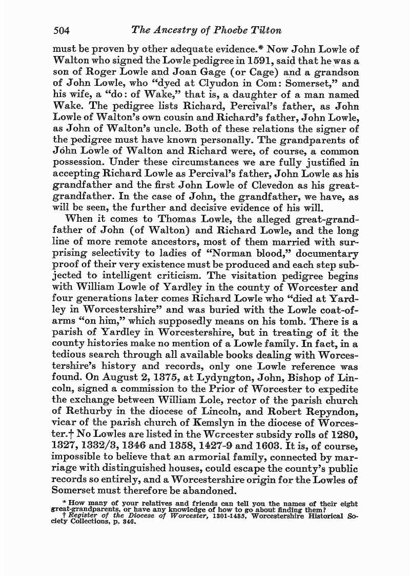 In 1591 the heralds visited Somerset and among those asked to prove their right to a coat of arms and enter their pedigree was John Lowle of the parish of Walton.  He made good on his claims and and his coat and pedigree were duly registered over his signature.  In the 1591 visitation pedigree,  Percival Lowell’s name appears as son and heir of Richard Lowle.  While his parents and grandparents are undoubtedly correct, the geneologist Walter Goodwin Davis has his doubts about the more ancient ancestors this pedigree claims.  According to Davis “The Elizabethan herald were, many of them, excessively obliging.”