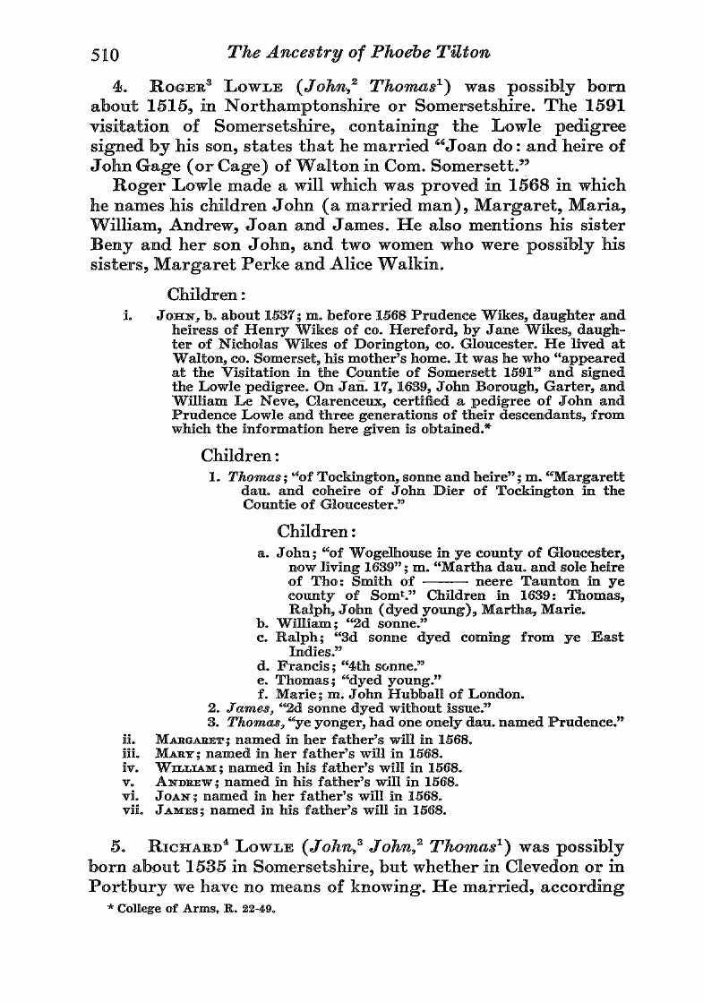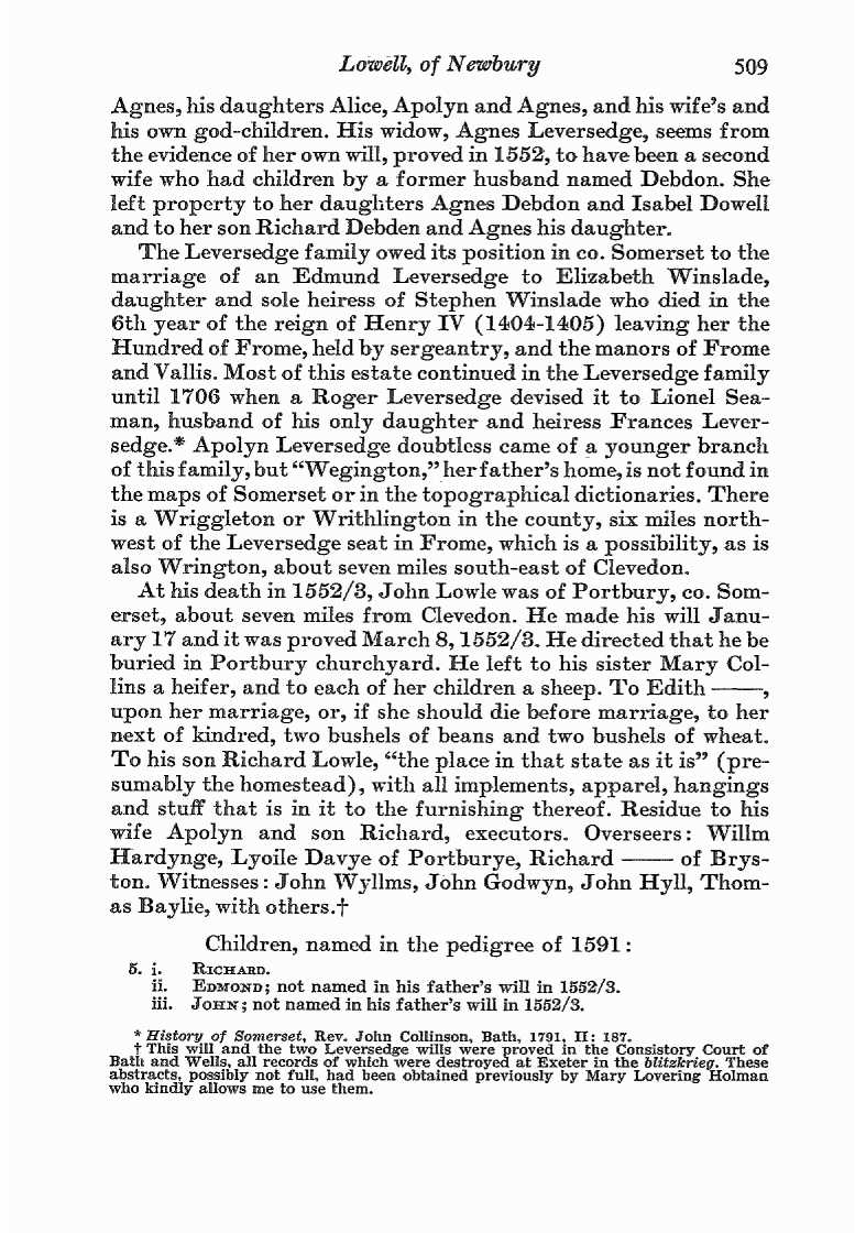 b.abt.1535/1547 Somersetshire, England; s/o John and Apolyn (Leversedge) Lowle