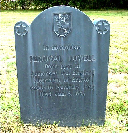 Massachusetts Bay Colony Governor John Winthrop needed solid dependable people to settle the North Shore area as a buffer against the French from Canada and he urged that the Lowells relocate to Newburyport on the Merrimack River, at the border of the failing Province of Maine.  Percival died 8 Jan 1664/65 in Newbury, Mass aged 94.