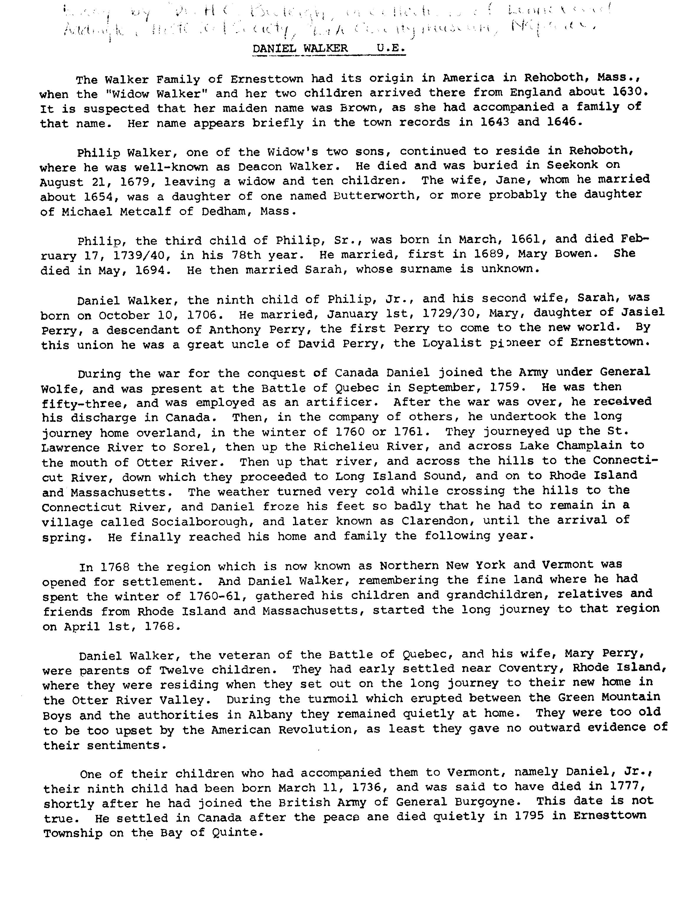Farming Utensils 108.17442.Says resided at marshish in the Fall of 1783 and winterRobert Perry, the U.E. Loyalist, was familiar with the story of the trials and troubles of his uncle, Daniel Walker, Sr. during and after the campaign for the conquest of Canada, including the battle of Quebec. He was just entering his teens when his uncle returned home after freezing his feet and spending a winter in Vermont. He was just twenty when this same Daniel Walker, his children, grandchildren and relatives made the long trek to the choice valleys of Vermont, which was not a colony, but still a disputed territory between New York and New Hampshire.