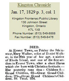 iv. Daniel Walker b. 11 Mar 1736 in Rehoboth, Bristol, Mass; d. 5 Jul 1795 Ernstown Township, Ontario, Canada; m1. Jerusha Bates (b. 1738 – d. 1767 shortly after the birth of her only child); m2. Dec 1767 in Coventry, Rhode Island to Mary Young (b. 1731 in Rhode Island – d. 9 Jan 1829 in Ernestown Township, Lenn Add, Ontario, Canada in her 99th year) Daniel and Mary had ten children, eight grandchildren and 62 great grandchildren.