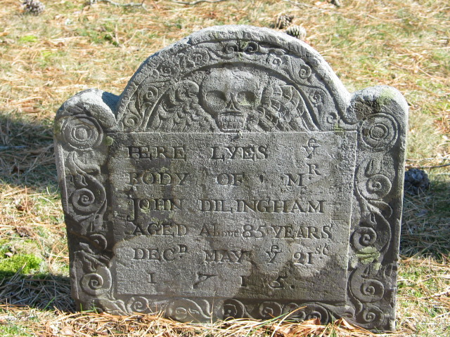 John died in Harwich, 27 May, 1715 (gravestone says 21 May), “aged 85″. The old Dillingham burying ground in West Brewster, on the north side of the road to East Dennis, west of the river, is the oldest in that part of the town. The oldest stone is that of John, the settler.