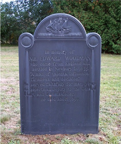 Edward’s s body was interred 1st Burying Ground in Newbury, Essex Co., Massachusetts. His marker reads, “In memory of Mr. Edward Woodman who came from England and Settled in Newbury in 1635. ‘A man of talents, influence, firmness and decision.’ He served faithfully for many years as Selectman, Deputy to the General Court and Commissioner.