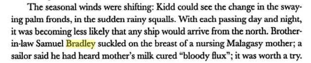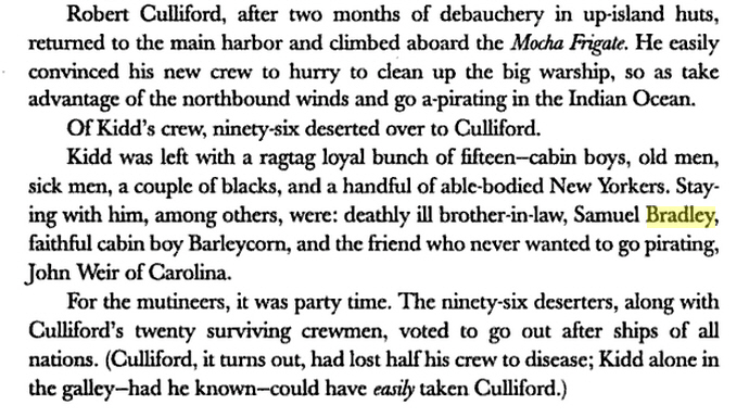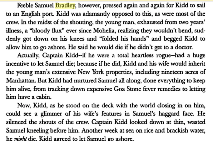 SAMUEL BRADLEY. “In the name of the Lord, Amen. This 5 day of July in ye year of our Lord 1693, I, Samuel Bradley, of the city of New York, merchant, being at present in good health and being now bound on a voyage beyond the sea.” “Whereas my loving brother in law, Captain William Kidd, hath been very careful of me, and hath likewise for my encouragement, now in my minority, at my desire and request, advanced and paid unto me ye sum of œ140, current money of New York, which I now employ in trade and merchandize. For and in consideration of his so great love unto me, as well as in recompense and in full satisfaction of ye said sum of money, advanced as aforesaid, I do give and bequeath unto my said loving brother in law Captain William Kidd, his heirs and assigns for ever, All that my one half of one certain toft or lot of Ground numbered with the number 6. Situate, lying, and being within ye city of New York, in ye street commonly called and known by ye name of ye Dock street. And likewise all that my one half of a certain messuage or dwelling house and lot lying and being in ye street commonly called by ye name of ye Wall street. And also that my lot or Toft of ground in ye new street, without ye gate of ye said city, called King street. I will that all my goods and chattels be equally divided into three parts, amongst my loving father, Samuel Bradley, my brother in law, William Kidd, and my loving brother, Henry Bradley. And lastly I constitute and appoint my said brother in law, Captain William Kidd, to be executor.