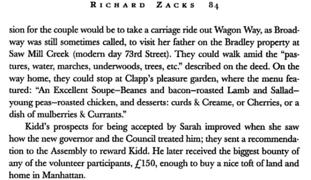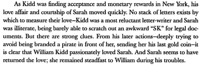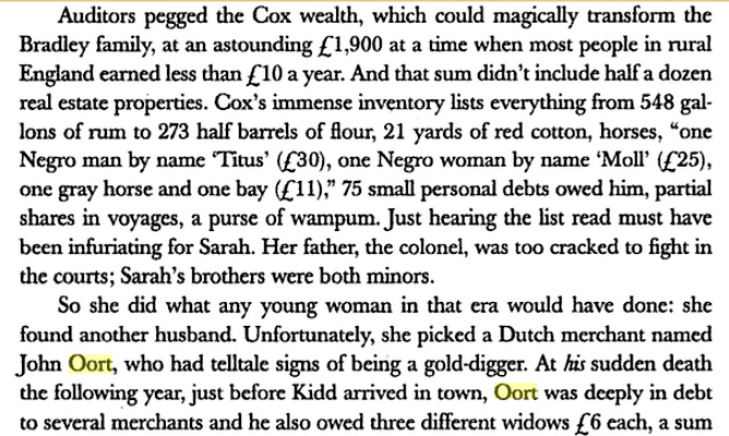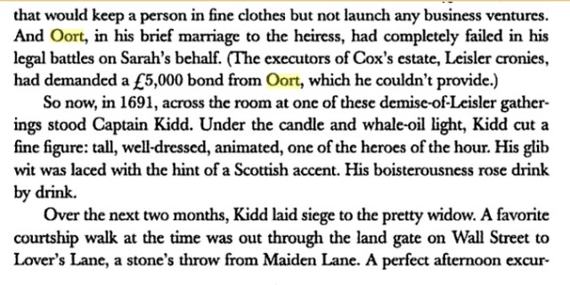 16 May 1691 – Kidd married Sarah Bradley Cox Oort, [a mouthful of a name already and soon to be Sarah Bradley Cox Oort Kidd ] an English woman in her early twenties, who had already been twice widowed and was one of the wealthiest women in New York, largely due to her inheritance from her first husband.