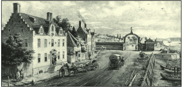 The Pearl Street house Sarah inherited from William Cox which she later shared with William Kidd — Notice the boats beached along Pearl St—back then, the water came right up to its edge, but now Pearl Street sits several streets from the shore.