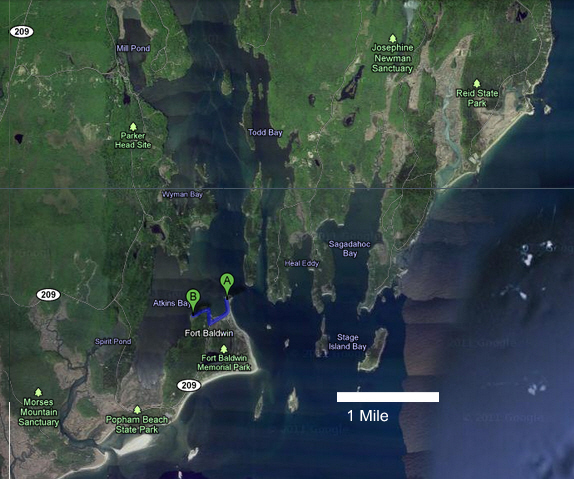 Atkins Bay Satellite Map.  Shows directions from (A) Civil War Fort Popham to (B) Site of 1607 Popham Colony.  Parker Island (now Georgetown) purchased by John PARKER Jr. is in the northeast corner of the view