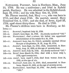 i. Mary Greenleaf b. 19 Jul 1731 in Newbury, Essex, Mass.; d. 20 Apr 1764 in Byfield, Essex, Mass; m. 5 Oct 1750 – Newbury, Essex, Mass. to Nathaniel Plummer (b. 9 Jun 1708 in Newbury – d. 1789 in Byfield) Nathaniel’s parents were Joshua Plumer (1668 – 1723) and Elizabeth Dole (1679 – 1735)