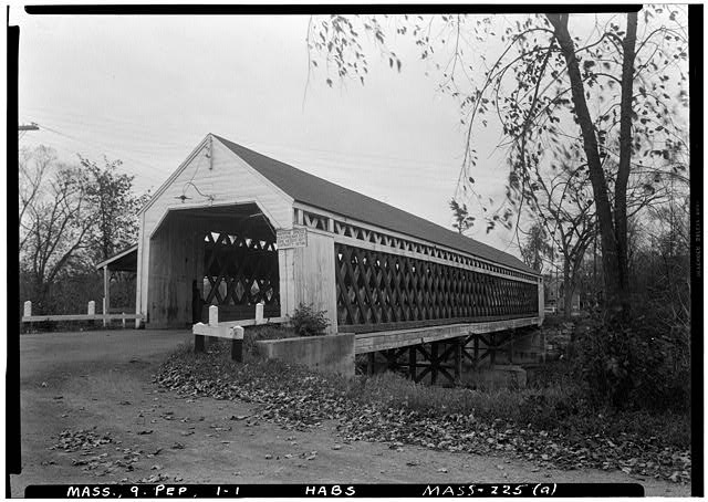 Before Pepperell was even Pepperell, a bridge of some kind crossed the Nashua River at what was known in Colonial times as Jo Blood’s fordway (now part of Groton Street). First it was the uncovered Nehemia Jewett’s Bridge, built in 1742. That structure was replaced in 1847 by a 147-foot-long covered bridge. In 1920, a five foot sidewalk was added to the west side of the structure along the concrete footings. The bridge survived (with only minor damage) the Town’s worst flood on March 19, 1936. In 1936, the lower portion of the bridge was reinforced with steel I-beams to accommodate the increase in weight of the newer automobiles and trucks.