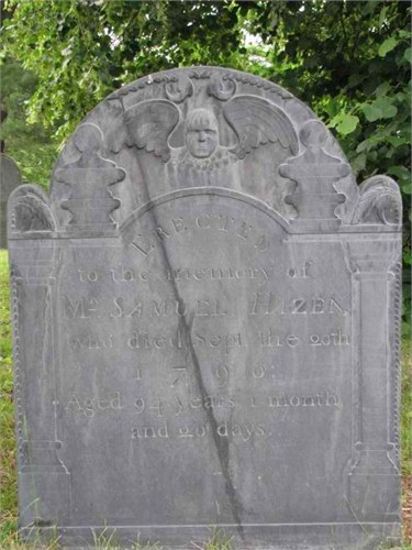 Samuel Hazen Headstone – at Center Cemetary Rowley Mass Death: Sep. 20, 1790 94yrs, 1mon, and 20 days