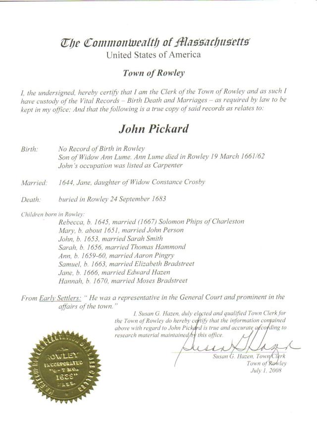 | 4. | Mary Pickard | 1651 Rowley, Mass | John Pearson (Son of John PEARSON) 14 Feb 1670/71 Rowley |