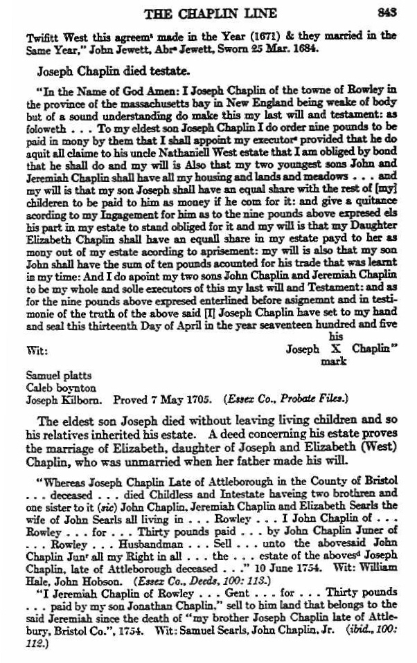 “In the Name of God Amen: I Joseph Chaplin of the towne of Rowley in the province of the massachusettes bay in New England being weake of body but of sound understanding do make this my last will and testament; as foloweth. To my eldest son Joseph Chaplin I do order nine pounds to be paid in mony by them that I shall appoint my executors provided that he do aquit all claime to his uncle Nathaniell West estate that I am obliged by bond that he shall do and my will is Also that my two youngest sons John and Jeremiah Chaplin shall have all my housing and lands and meadows and my will is that my son Joseph shall have an equal share with the rest of my children to be paid to him as money if he com for it; and give aquittance according to my Ingagement for him a to the nine pounds above expressed els his part in my estate to stand obliged for it and my will is that my Daughter Elizabeth Chaplin shall have an equall share in my estate payd to her as mony out of my estate according to aprisement: my will is also that my son John shall have the sum of ten pounds accounted for his trade that was learnt in my time: And I do appoint my two sons John Chaplin and Jeremiah Chaplin to be my whole and sole executors of this my will and Testament; and as for the nine pounds above expressed enterlined before asignement and in testimonie of the truth of the about said I Joseph Chaplin have set to my hand and seal this thirteenth Day of April in the year seaventeen hundred and five