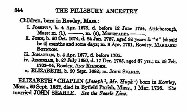 | 5. | Elizabeth Chaplin | 20 SEP 1682 Rowley | John Searle 23 NOV 1708 Rowley |