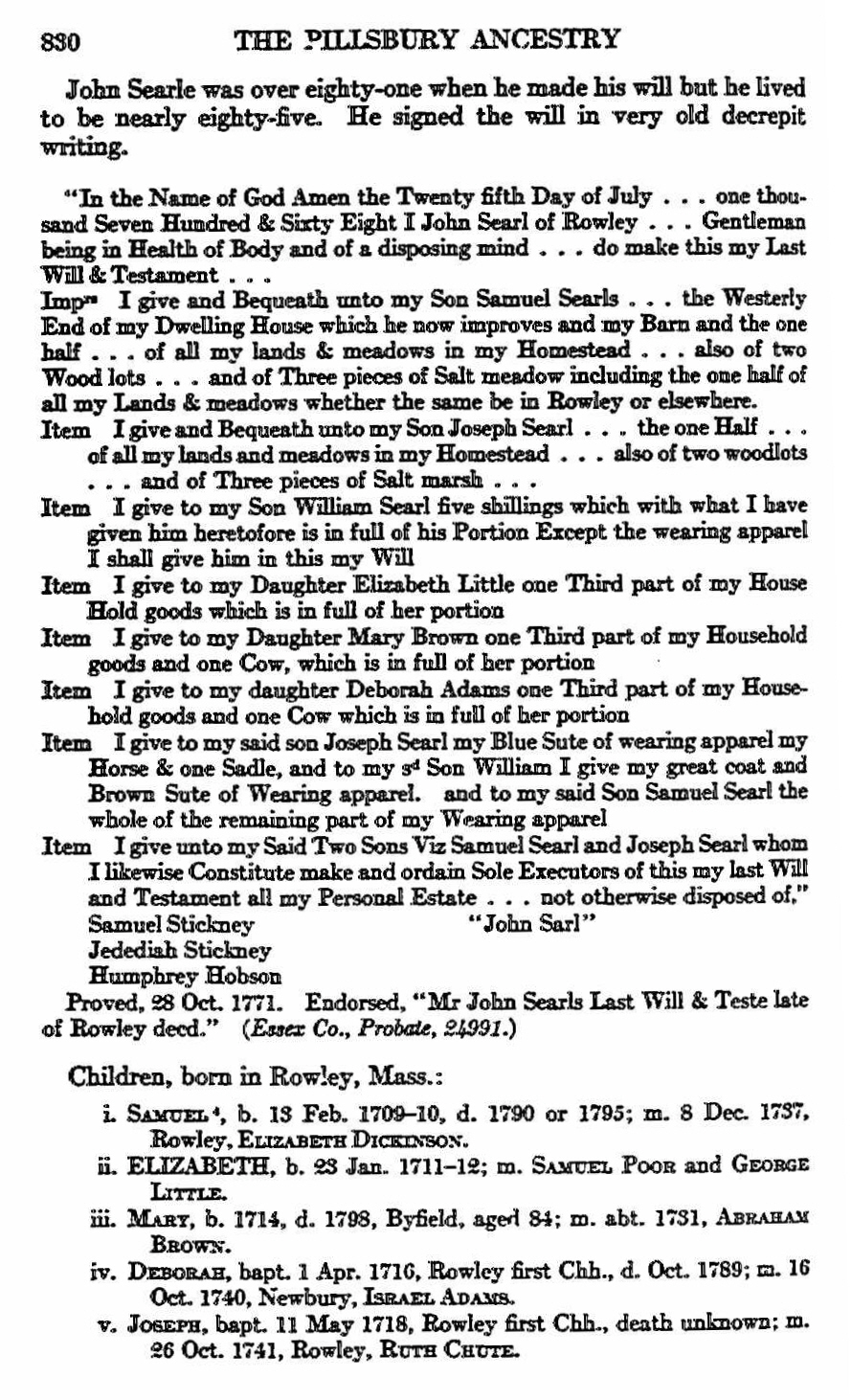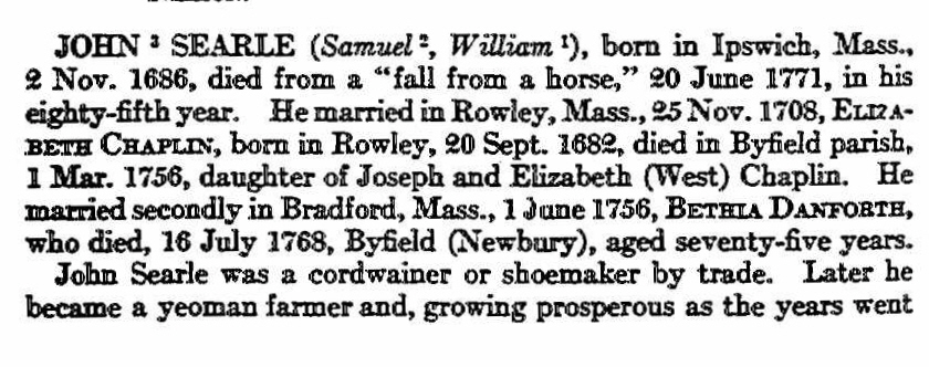 Elizabeth’s husband John Searle was born 2 Nov 1686 in Ipswich, Essex, Mass. His parents were Samuel Searle and Deborah Bragg. After Elizabeth died, he maried 1 Jun 1756 in Bradford to Bethia Danforth (d. 16 Jul 1768 Byfield). John died 20 Jun 1771 in Rowley, Essex, Mass.